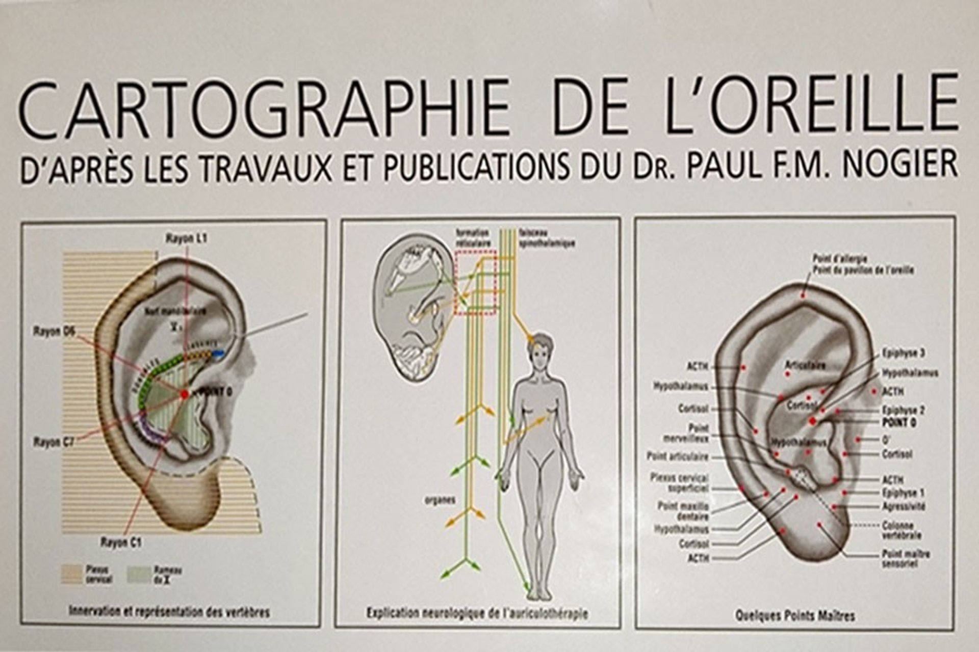 L'auriculothérapie ou réflexologie auriculaire a été découverte en 1951 par le Docteur Nogier à Lyon. En 1990 un groupe de travail réuni par l'Organisation Mondiale de la Santé a standardisé la nomenclature de 43 points auriculaires. La pratique consiste à stimuler certains points précis de l'oreille à l'aide de différents outils (aiguilles d'acupuncture stériles et à usage unique, ASP qui sont des micro clous posés pour plusieurs jours, magrains qui sont de petites billes en métal, stimulation électrique, laser... J'utilise un premio 20DT, appareil de fabrication française (Sedatelec), qui me permet de détecter les points sensibles et de pratiquer une stimulation électrique, puis j'effectue la pose de magrains qui continueront à agir dans le temps. Cette réflexologie au niveau des oreilles permet notamment de soulager les douleurs. J'ai été formée à la réflexologie auriculaire par Roland Fietta, naturopathe, réflexologue, masseur kinésithérapeute diplômé d'état, ostéopathe, hygiéniste et diététicien, également auteur et conférencier.
